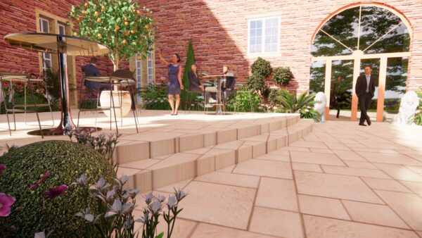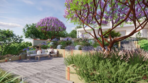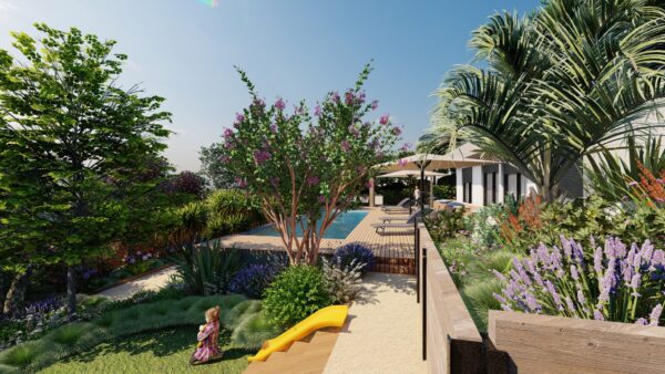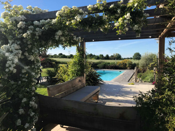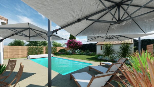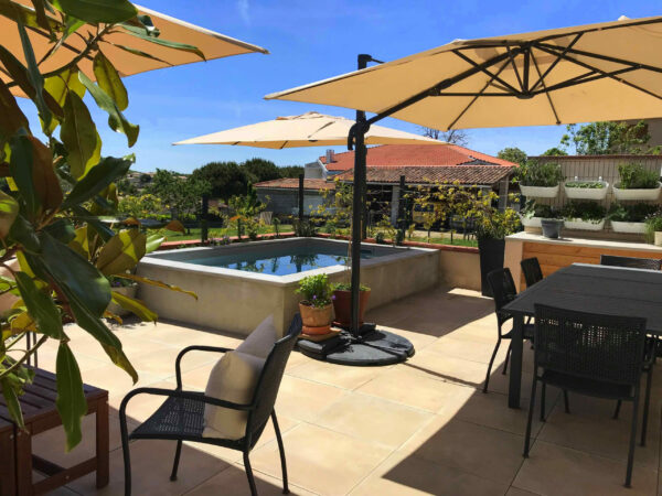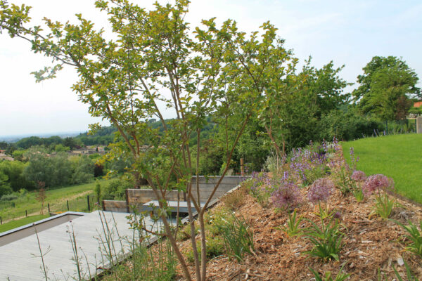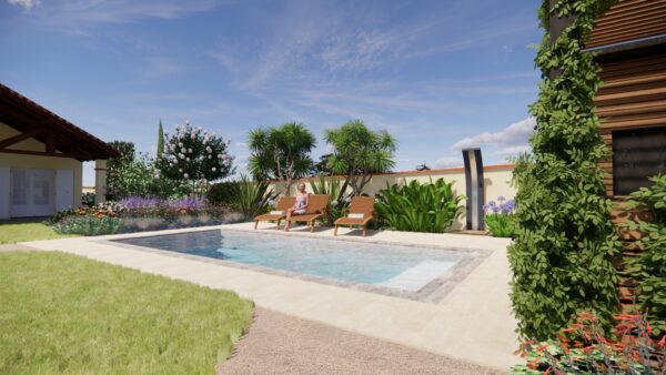 In a garden largely occupied by a single pin causing damage to the house our clients brief was to create a new outdoor space for meeting with friends and swimming. We have created a dining terrasse and a relaxation space by the pool. We included a pool with a waterfall, natural stone paving, a made…
